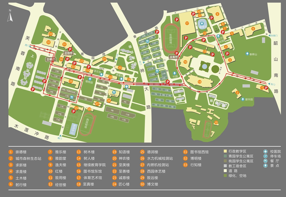 2.新生报到车辆从韶山路大门进入,在报到点附近指定停车位停放,报到完毕后步行至学生宿舍;