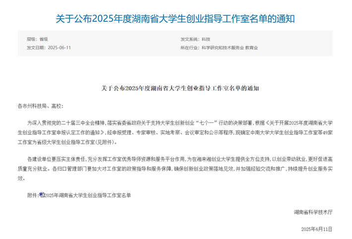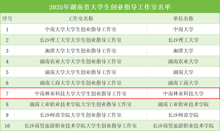【林大网讯】(文/创新创业学院)近日,湖南省科学技术厅公布了2025年度湖南省大学生创业指导工作室名单,我校创新创业基地成功入选。