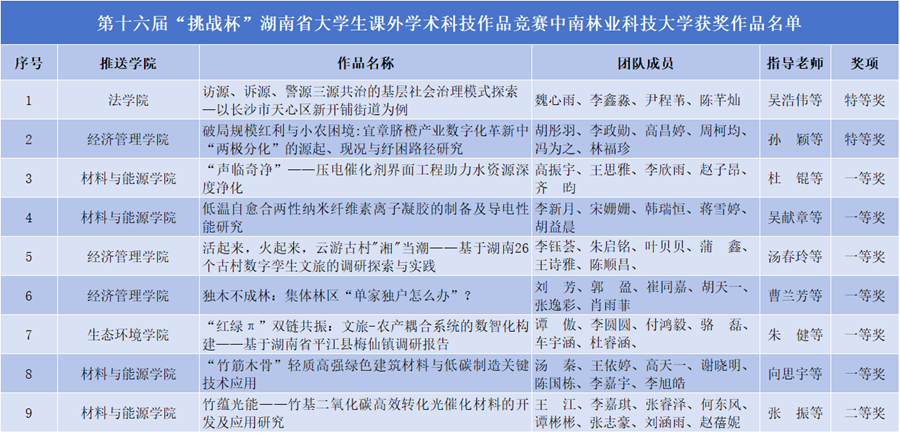 【林大网讯】(文/校团委)6月13日,第十六届“挑战杯”湖南省大学生课外学术科技作品竞赛终审决赛落下帷幕。我校报送的参赛作品获特等奖2项、一等奖6项、二等奖1项、三等奖11项,团体总分位居全省高校前列,学校再捧“优胜杯”荣誉称号,一等奖获奖数和获奖总数均创新高。