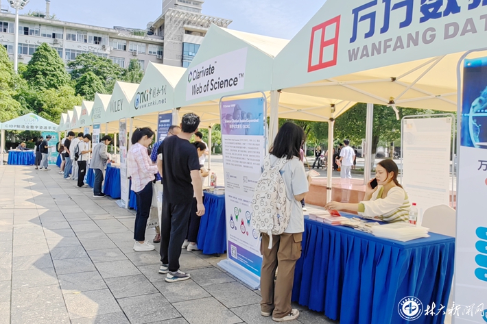 活动当天,在图书馆东馆前坪举行了数图资源游园展。现场设置多个展区,展示学术数据库、电子书平台及科研工具,吸引师生体验“指尖阅读”。