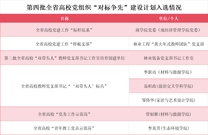 【林大网讯】(文/组织部)近日,省委教育工委公布全省高校党组织“对标争先”建设计划第四批项目和第二批高校“双带头人”教师党支部书记工作室评选结果,我校3个集体、5名个人入选。