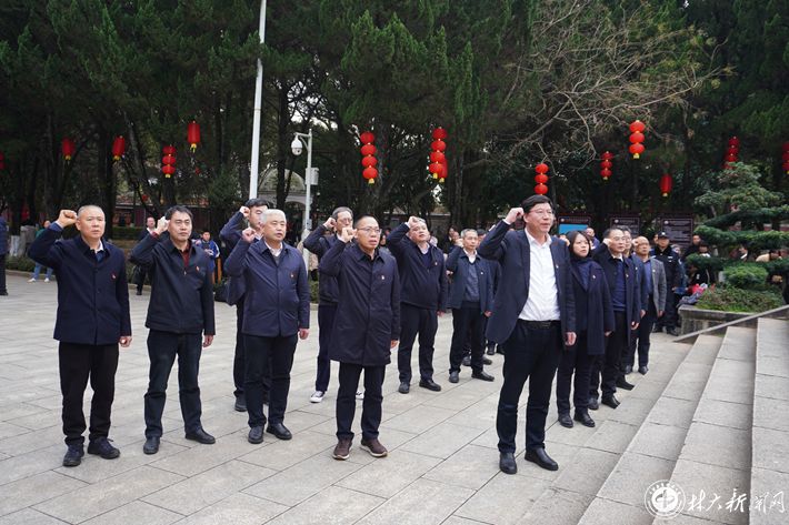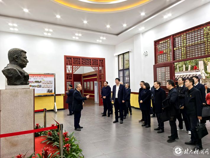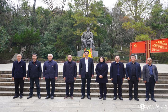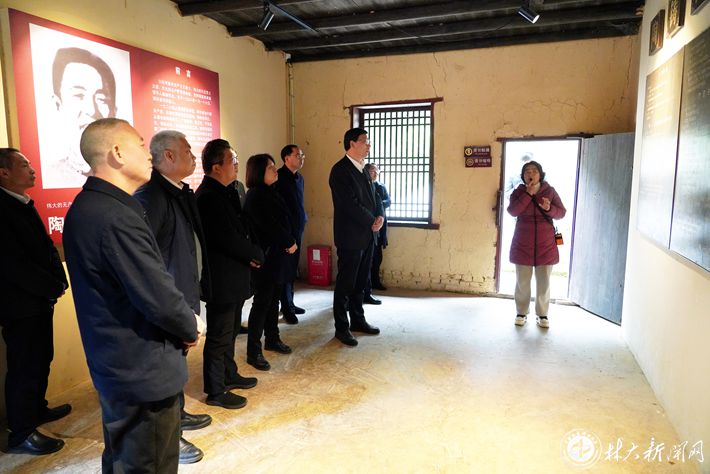 在陶铸廉政文化教育基地,党委中心组全体成员怀着无比崇敬的心情瞻仰陶铸铜像、敬献花篮并向陶铸同志铜像三鞠躬。随后,吴义强领誓,带领大家重温入党誓词,深切缅怀陶铸同志的革命精神和松树风格。在陶铸故居和陶铸生平事迹陈列馆,党委中心组全体成员认真聆听讲解,仔细观看珍贵的历史图片和文物资料,深切缅怀陶铸同志为党和人民事业鞠躬尽瘁、死而后已的光辉一生,深刻感悟陶铸同志“心底无私天地宽”的崇高精神境界。