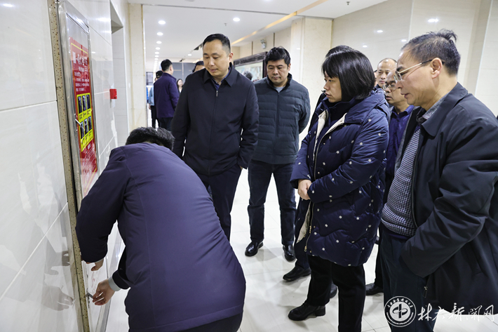 仇怡一行先后来到西园图书馆、桃园学生宿舍、西园在建学生公寓、诚意楼、神农楼、创新创业基地、岳麓山实验室等重要防火部位和重点工程现场,对电气设备安全防护、消防设施配备维护等情况进行全面检查,现场查看在建重点工程施工进度、质量把控、安全生产措施等落实情况,听取有关情况汇报,对存在的问题和安全隐患,提出整改意见,要求限期整改。