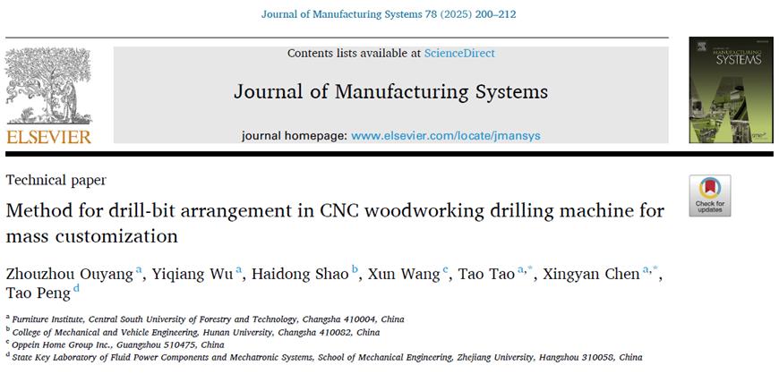 【林大网讯】(文/材料科学与工程学院 欧阳周洲)近期,国际工程技术与管理顶级期刊《Journal of Manufacturing Systems》(中科院Top一区期刊,影响因子12.2)上发表我校家具智能制造陶涛教授团队的研究论文“Method for Drill-Bit Arrangement in CNC Woodworking Drilling Machine for Mass Customization”(面向大规模定制的木工数控钻孔加工中心钻头布置方法)。这是我校首次在该期刊上发表学术成果,实现了家具研究领域发表SCI高影响因子论文的突破。