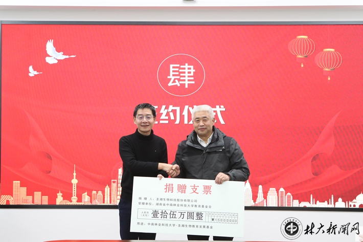 仪式上,双方签署协议,圣湘生物向我校教育基金会捐赠人民币15万元,设立“中南林业科技大学-圣湘生物教育发展基金”,支持我校人才培养和教育事业发展。