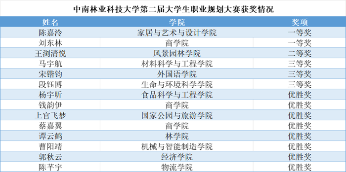 14位决赛选手结合生涯发展目标进行主题陈述,并与评委互动交流,现场气氛热烈。来自中海物业、中铁五局、湖南兴元科技、黑马科技、湖南师范大学、长沙理工大学等单位的相关专家受邀担任比赛评委,他们充分肯定了选手们的精彩表现,并针对个人综合表现提出了建设性的意见与建议。经过激烈角逐,最终决出一等奖2名、二等奖1名、三等奖3名、优胜奖8名。