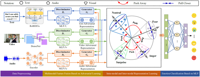 随着人机交互的快速发展,对话中的多模态情绪识别(MERC)任务开始受到广泛的研究关注。MERC任务是通过提取和融合不同模态的互补语义信息来对人类语言表达情感进行精准识别。针对现有跨模态特征融合方法无法消除不同模态之间的异质性,本研究提出了一种新的基于信息瓶颈的对抗对齐和图融合对话中的多模态情感识别(AGF-IB)模型。