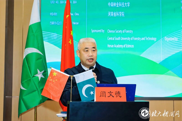 副校长闫文德出席会议并致辞。他向远道而来、不辞辛劳的中巴两国专家学者和国际友人表示热烈的欢迎和诚挚的问候。他指出,中巴热带干旱经济林科技交流会议是中巴两国经济林产业发展相互交流借鉴、相互促进发展的广阔平台,为“一带一路”沿线国家的绿色高质量发展贡献了中国林业科技。