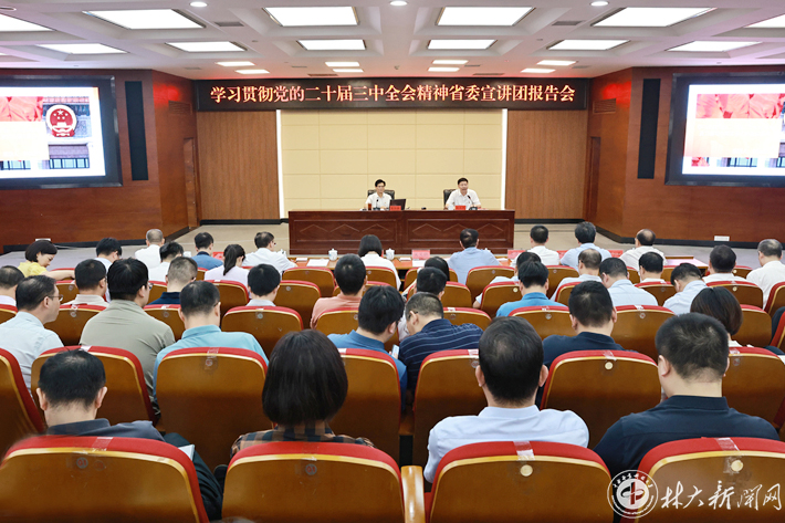 吴义强指出,此次宣讲报告内涵丰富、解读全面准确、案例鲜活生动、数据详实有力,对学校进一步全面深入学习宣传贯彻落实党的二十届三中全会精神具有很高的政策理论性和实践指导性。他强调,要切实把党的二十届三中全会精神学习好、宣传好、贯彻好,将全会精神转化为办学治校、改革发展的智慧方法;要将学习贯彻全会精神与贯彻落实全国教育大会精神紧密结合起来,牢牢把握教育的政治属性、人民属性、战略属性,围绕立德树人根本任务,大力弘扬教育家精神,着力培养造就卓越工程师、大国工匠、高技能人才、卓越农林人才等,切实办好人民满意的高等农林教育;要进一步加强对全会精神的深入学习和研究阐释,积极发挥学校人才智力优势,聚焦生态文明建设和美丽中国建设,力争建成一批“大平台”、承接一批“大项目”,产出一批“大成果”,塑造高质量发展新动能新优势,推动学校事业高质量发展取得新成效。(一审/李佳 二审/廖乐平 三审/周预分)
