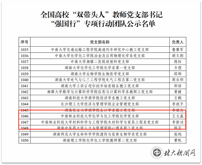 【林大网讯】(文/组织部 吴建国)近日,教育部思政司公示,我校化学与化工学院化学党支部和材料科学与工程学院木材科学与家具工程系党支部双双入选全国高校“双带头人”教师党支部书记“强国行”专项行动团队,林学院、水土保持学院经济林教工党支部入选湖南省高校“双带头人”教师党支部书记“强国行”专项行动团队。进一步丰富了学校 “对标争先”全国培育创建类型,提升了党建“双创”工作质效。