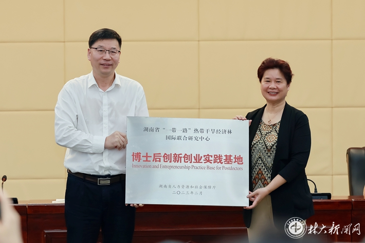 大讲堂围绕经济林建设发展分享了最新科研成果和实践经验,就干旱经济林产业发展趋势进行了展望。会上,张保中回顾了“一带一路”旗舰项目瓜达尔港的建设成功经验,高度肯定了我校在建设“瓜达尔绿洲”中所做的贡献。三亚林科院院长罗金环表示将发挥国家南繁科研育种基地优势,积极推动“一带一路”热带干旱经济林工程技术研究中心三亚分中心建设。省人社厅专技处副处长龙涛宣读了关于设立湖南省“一带一路”热带干旱经济林国际联合研究中心博士后创新创业实践基地的批复文件。冯奇为基地授牌。