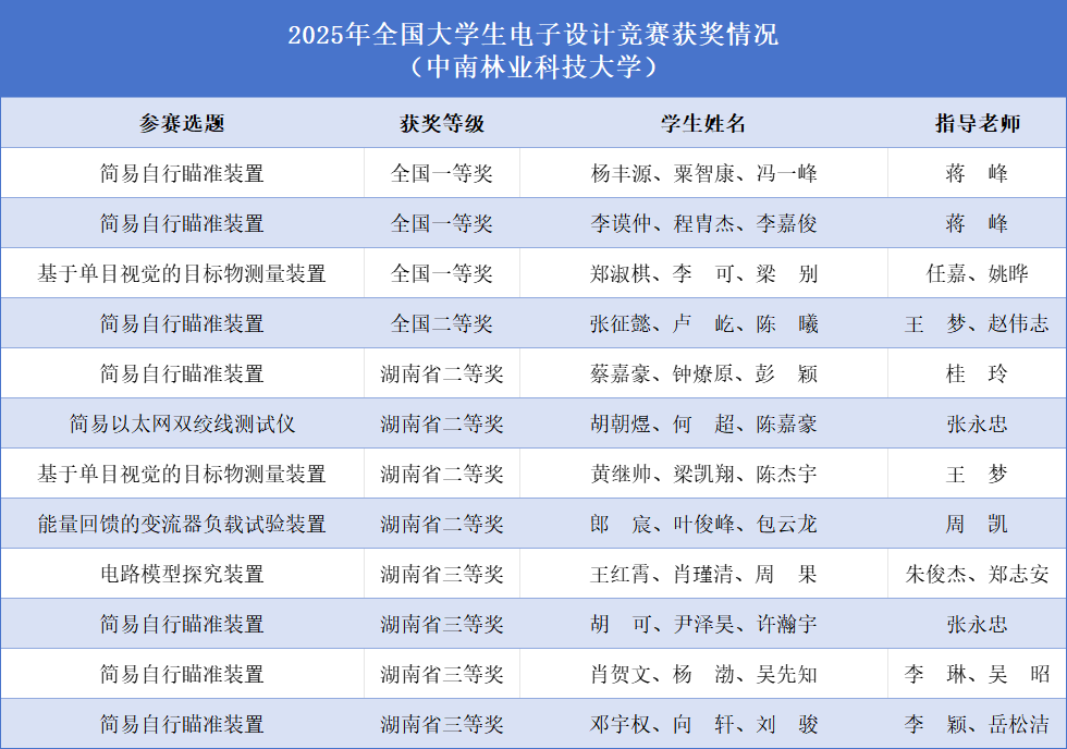 【林大网讯】(文/电子信息与物理学院)8月22日,2025年全国大学生电子设计竞赛在大连理工大学圆满落幕。我校参赛团队荣获全国一等奖3项、二等奖1项,湖南省二等奖4项,三等奖4项,创造历史最好成绩。