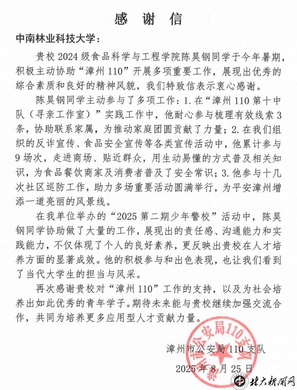 【林大网讯】2025年暑期,无数大学生走出校园、迈入社会,在实践中淬炼青春,在服务中彰显价值。食品科学与工程学院学生陈昊钢,主动返回家乡福建漳州,投身“漳州110”暑期社会实践,凭借扎实的专业知识、高度的责任意识和真诚的服务热情,在寻亲支援、治安巡防、安全宣传等多个岗位表现出色,受到“漳州110”的高度认可,成为校地协同育人中涌现的先进典型。