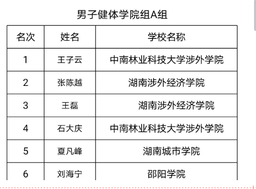 近日,从第五届大学生健身竞赛传来喜讯,中南林涉外学子在此次竞赛中取得优异成绩。由我院朱砂老师、熊东进老师担任教练,在经过了激烈的角逐后,男子健体学院A组王子云获得组内第一名、石大庆获得组内第四名;男子健身先生学院B组芦文亮获得组内第一名;男子健身模特学院A组石大庆获得组内第一名、王子云获得组内第二名;男子健体学院B组芦文亮获得组内第二名、陈环宇获得组内第三名,匡禹澎获组内第六名;男子健身模特学院、高职组B组陈环宇获得组内第一名、芦文亮获得组内第三名、匡禹澎获组内第五名、贺博获组内第六名。